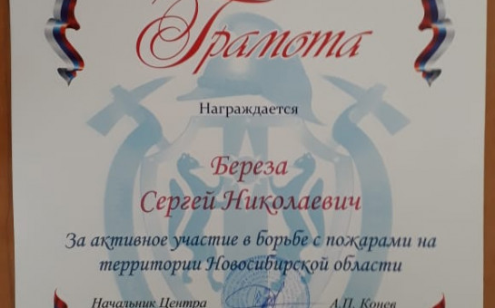 Председателем совета добровольной пожарной охраны Краснозерского района Васильченко Борисом Алексеевичем была вручена почетная грамота члену патрульно-маневренной группы, водителю администрации Орехово-Логовского сельсовета Краснозерского района Новосибирской области Берёза Сергею Николаевичу -за активное участие в борьбе с пожарами на территории Новосибирской области!